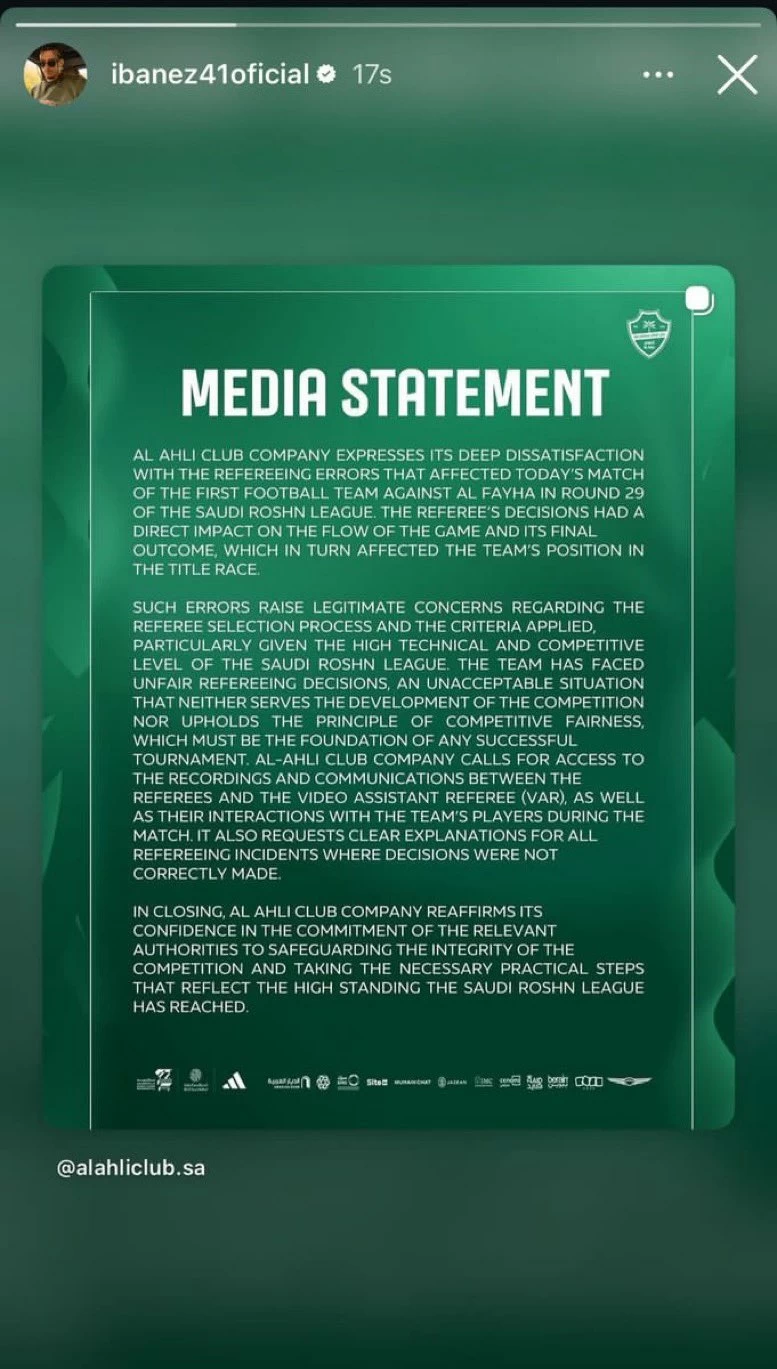 A defender for Al-Ahli, Roger Ibanez, reposted the official statement issued by his club following his team’s match against Al-Faihah on his Instagram account. The match had sparked widespread controversy over some refereeing decisions.